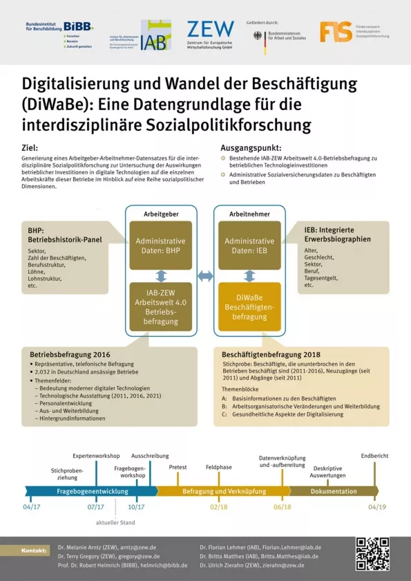 Die Digitalisierung der Arbeitsprozesse schreitet immer weiter voran und führt zu einem grundlegenden Strukturwandel in der Arbeitswelt, der vielfältige Herausforderungen für verschiedene Bereiche der Sozialpolitik mit sich bringt. Im Rahmen dieses Projektes wird ein Arbeitgeber-Arbeitnehmer-Datensatz für die interdisziplinäre Sozialpolitikforschung generiert, mit dem die Auswirkungen betrieblicher Investitionen in digitale Technologien auf die einzelnen Arbeitskräfte dieser Betriebe im Hinblick auf eine Reihe sozialpolitischer Dimensionen untersucht werden können. Das gemeinsam von BIBB, IAB und ZEW durchgeführte Projektvorhaben baut dazu auf die bestehende IAB-ZEW Arbeitswelt 4.0 Betriebsbefragung auf, welche die Digitalisierung in den Betrieben bereits abbildet. Der Datensatz wird mit Sozialversicherungsdaten der Beschäftigten dieser Betriebe verknüpft und um eine Befragung der Beschäftigten ergänzt. Die Beschäftigtenbefragung bildet sozialpolitische Dimensionen ab, welche in den administrativen Daten nicht verfügbar sind, etwa im Hinblick auf gesundheitliche Folgen oder die Beschäftigungsfähigkeit der Individuen.