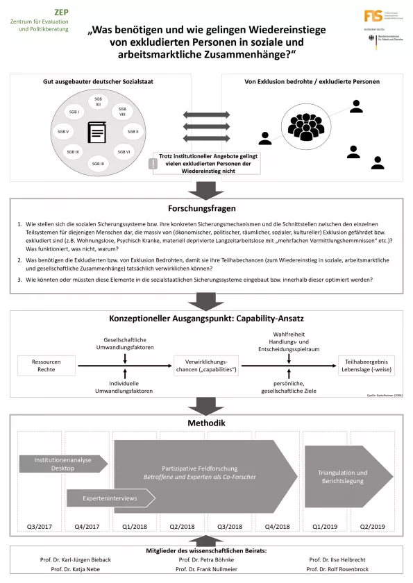 Das ZEP - Zentrum für Evaluation und Politikberatung untersucht deshalb in diesem Projekt auf Basis des Capability-Ansatzes mit Methoden der Institutionenanalyse und der partizipativen Forschung unter Einbeziehung von Experten und Betroffenen folgende Forschungsfragen: