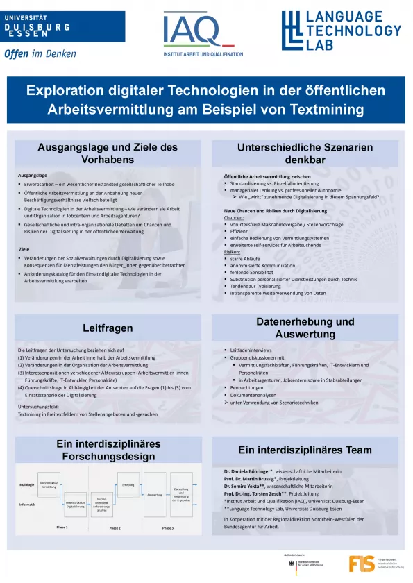 Das geplante Vorhaben untersucht, wie der Einsatz digitaler Technologien Arbeit und Organisation in Arbeitsagenturen und Jobcentern verändert. Die Untersuchung legt ein konkretes Anwendungsbeispiel digitaler Technologien zugrunde, nämlich das Textmining in Freitextfeldern von Stellenangeboten und -gesuchen. In einer interdisziplinären Zusammenarbeit von Soziologie und Informatik werden Veränderungen in der Arbeit und Organisation der Arbeitsvermittlung in Abhängigkeit von verschiedenen Szenarien der Digitalisierung untersucht.