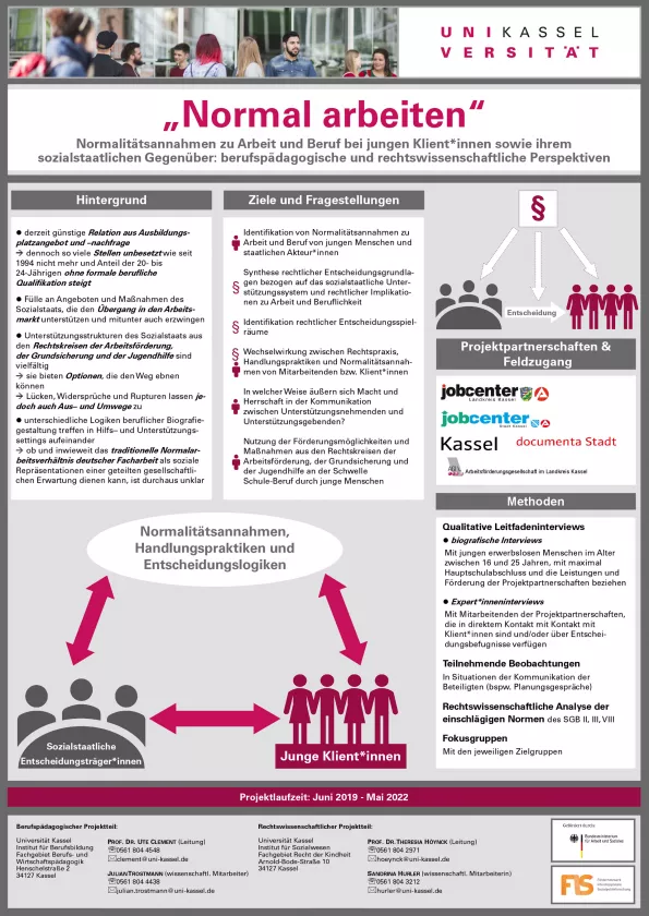 Das Projektteam „normal arbeiten“ unter der Leitung von Prof. Dr. Ute Clement (Berufs- und Wirtschaftspädagogik) und Prof. Dr. Theresia Höynck (Rechtswissenschaften) von der Universität Kassel untersucht Normalitätsannahmen und Erwartungen hinsichtlich Arbeit und Beruf. Dazu erhebt die Gruppe Daten zum einen bei jungen Menschen mit unterschiedlichen Exklusionserfahrungen zwischen 16 und 25 mit maximal Hauptschulabschluss und ohne Arbeits- oder Ausbildungsverhältnis, und zum anderen bei Beschäftigten sozialstaatlicher Einrichtungen, die diese Personen sozialstaatlich begleiten. Im Fokus des Interesses stehen Normalitätsüberzeugungen, aber auch Handlungsstrategien und Nutzung rechtlich vorhandener Optionen.