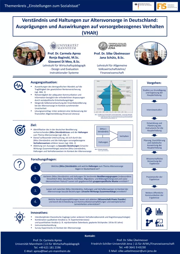 Beide Aspekte – Kommunikation bzw. Information und Financial Literacy - sollen zu gewünschten Verhaltensänderungen (Akzeptanz von Reformen, Engagement bei anderen Formen der Altersvorsorge) führen. Hierfür werden jedoch Kenntnisse darüber benötigt, ob und inwieweit die Bürger/innen das System der Altersvorsorge überhaupt adäquat verstehen. Die Bedeutung, die das Verständnis (bzw. Missverständnis) eines bestimmten Inhaltsbereichs für Meinungsbildung und Verhalten hat, wird durch Untersuchungen aus anderen Forschungsgebieten untermauert. Für den Bereich der Altersvorsorge liegen jedoch noch keine Befunde vor. Das Projekt möchte zur Schließung dieser Forschungslücke beitragen. Insbesondere werden die folgenden, zentralen sozialpolitischen Forschungsfragen untersucht: